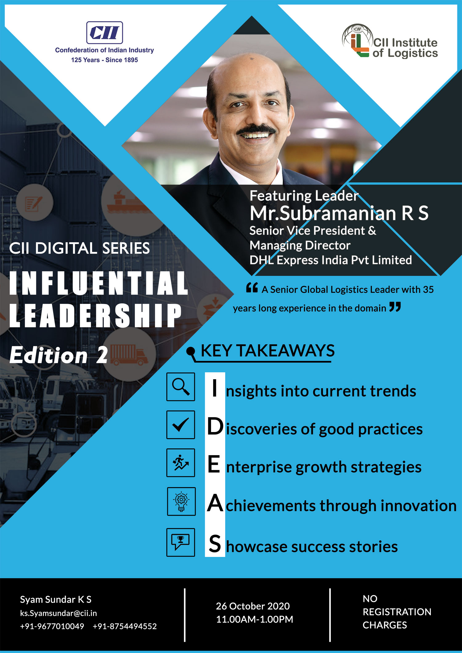 Sharing and disseminating important Insights on current trends, discussion on good practises, enterprise growth strategies, achievements through innovations, showcasing success stories with the external world would certainly be supportive for many Organizations to adopt and pace up in these challenging times. Meet Mr R S Subramanian in "Influential Leadership" programme on 26th October from 11am onwards. Mr.R S Subramanian popularly known as Subbu is the Senior Vice President and Managing Director at DHL Express Pvt Ltd, with 32 years of experience. He has a Bachelor's Degree in Engineering and a Masters in Management from IIM, Bangalore.